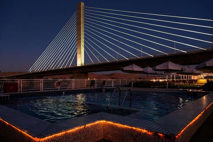 На рассвете открывается вид на пустыню и мост в Асуане. Здесь маршрут завершается. По правилам все дахабии должны провести ночь у пристани рядом с мостом — это требование властей.